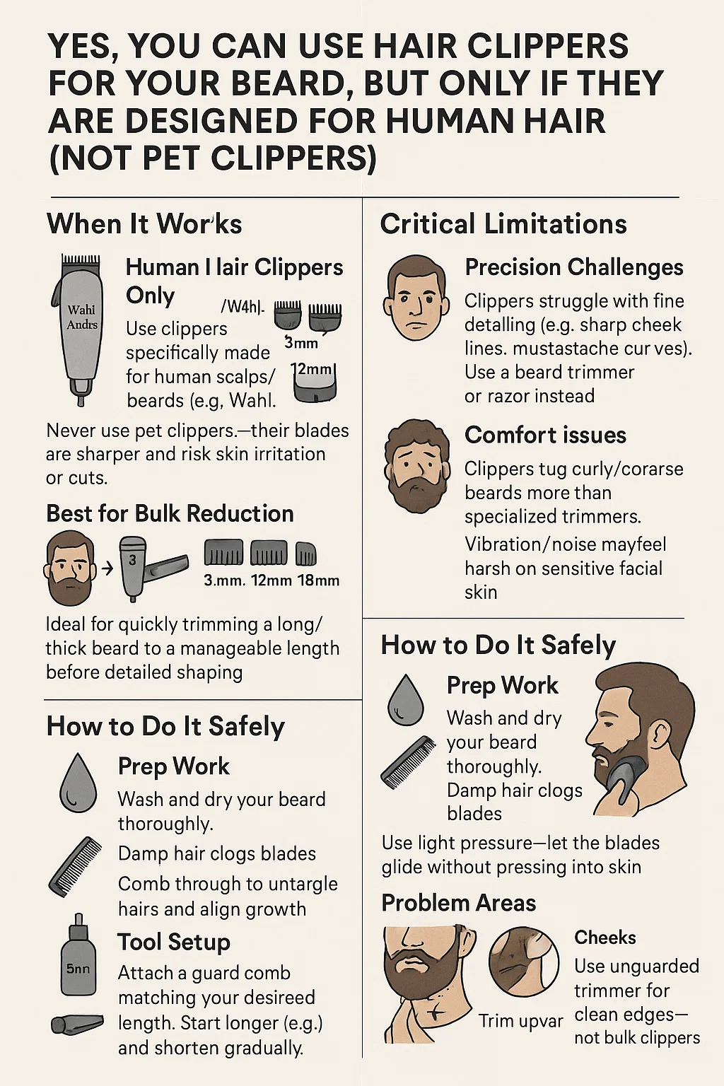 হ্যাঁ, আপনি ব্যবহার করতে পারেন চুল কাটা আপনার দাড়ির জন্য, তবে শুধুমাত্র যদি সেগুলি মানুষের চুলের জন্য ডিজাইন করা হয় (পোষা প্রাণীর ক্লিপার নয়)। এখানে একটি বিস্তারিত, ব্যবহারিক গাইড: