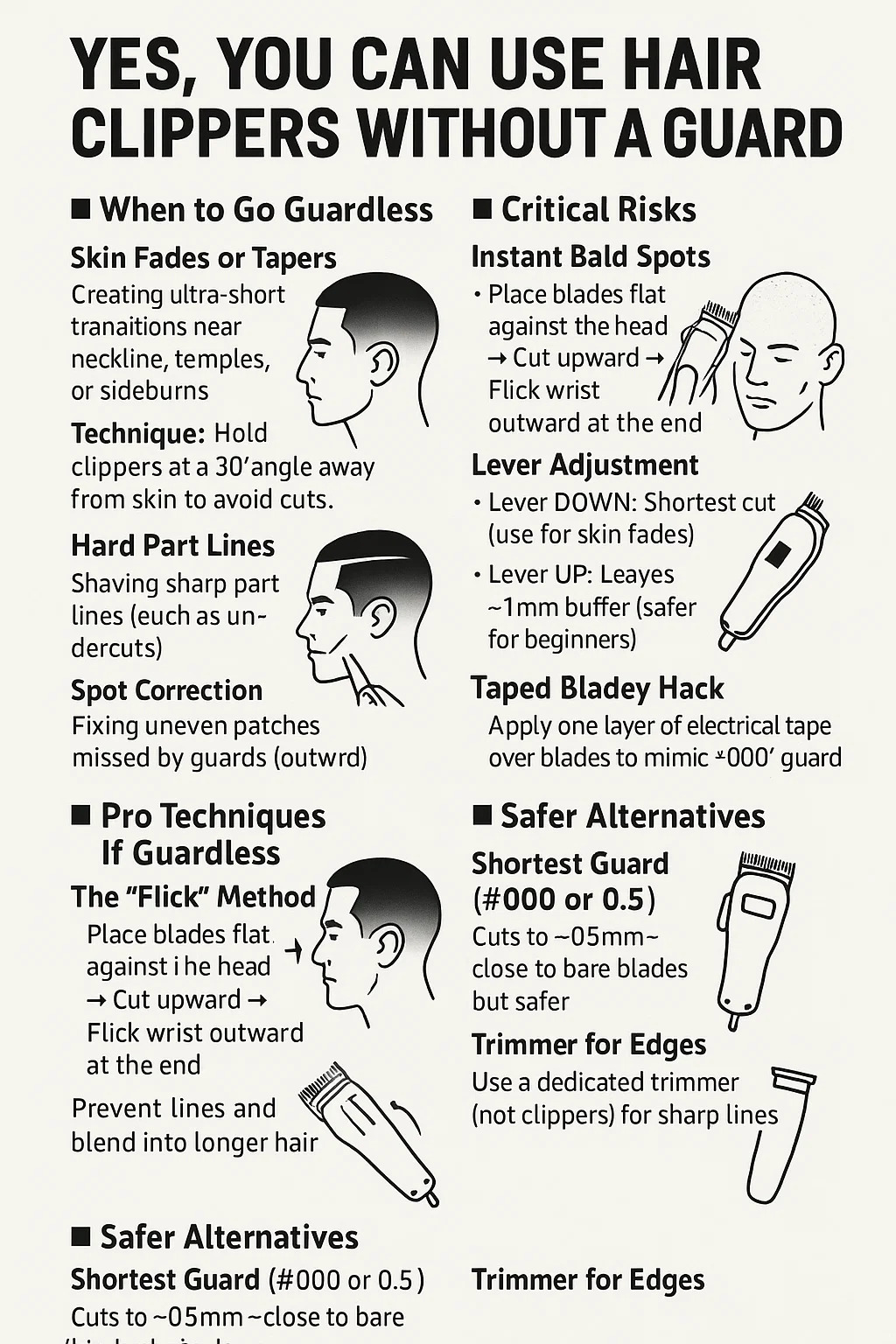 হ্যাঁ, আপনি ব্যবহার করতে পারেন চুল কাটা একটি গার্ড ছাড়া, কিন্তু এটি সতর্কতা এবং নির্দিষ্ট কৌশল প্রয়োজন. আপনার যা জানা দরকার তা এখানে:
