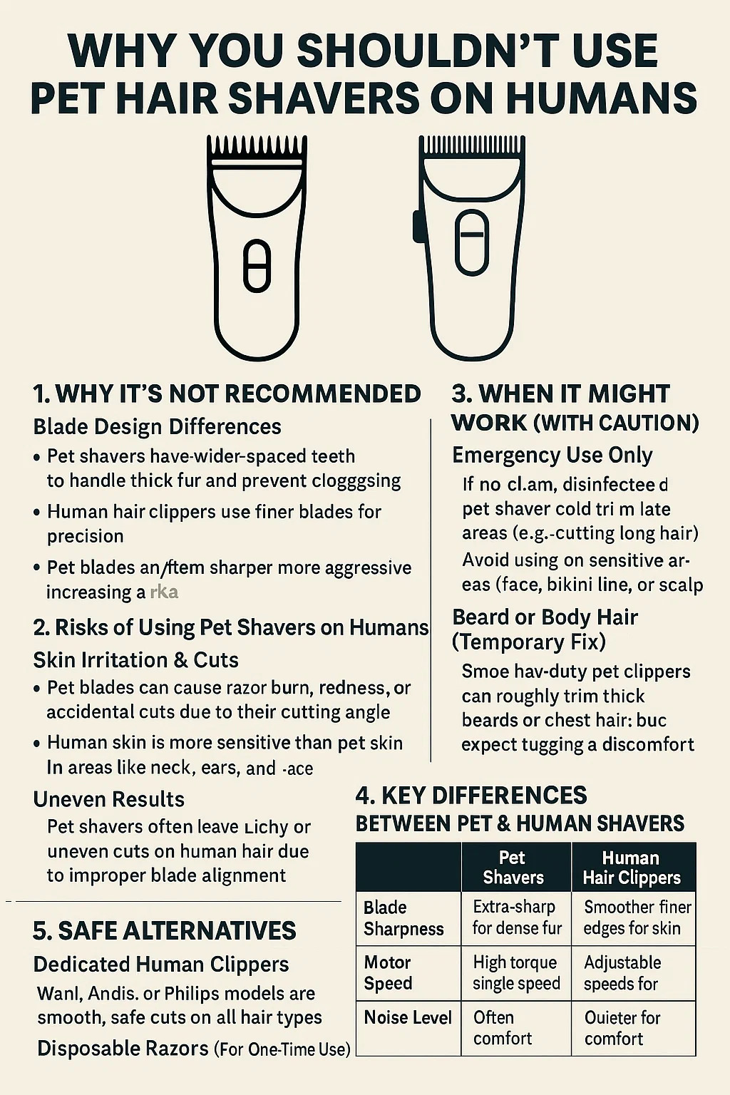 যখন পোষা চুল শেভারস এবং মানব চুলের ক্লিপারগুলি দেখতে একই রকম হতে পারে, মূল নকশা এবং সুরক্ষার পার্থক্যের কারণে এগুলি বিনিময়যোগ্য নয়। এখানে একটি বিস্তারিত ভাঙ্গন: