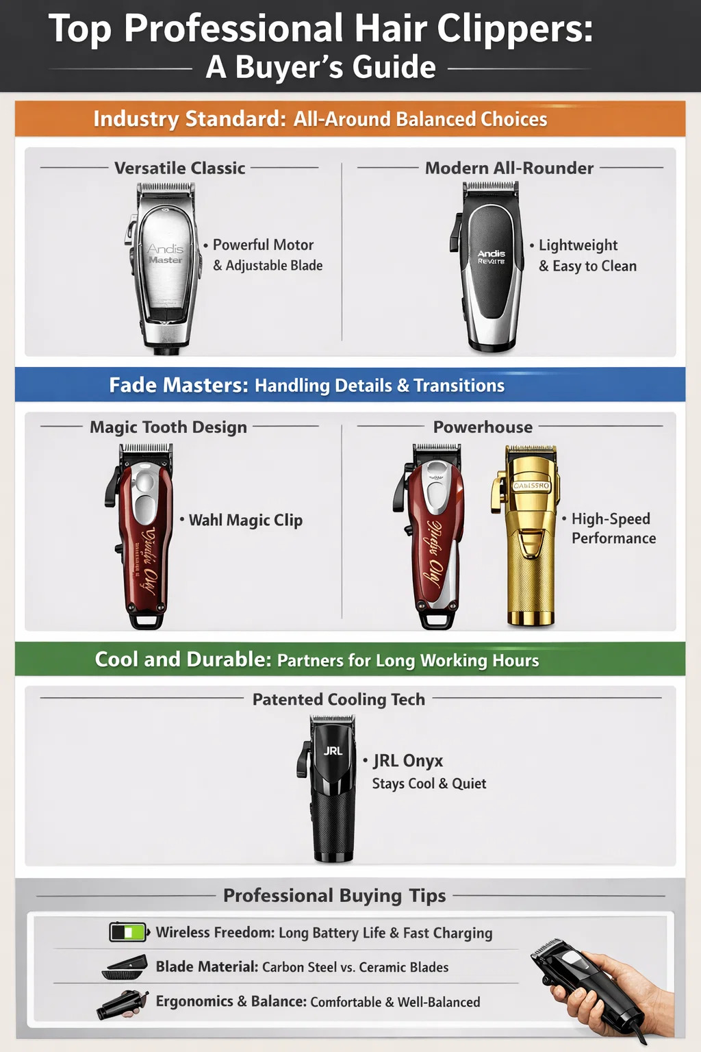 আপনি যদি পেশাদার-গ্রেড খুঁজছেন চুল কাটা , নাপিতরা সাধারণত ক্ষমতা, ব্লেডের তীক্ষ্ণতা এবং সুষম হ্যান্ডলিংকে অগ্রাধিকার দেয়। এখানে বর্তমানে বাজারে থাকা শীর্ষস্থানীয় কিছু পেশাদার মডেল রয়েছে: